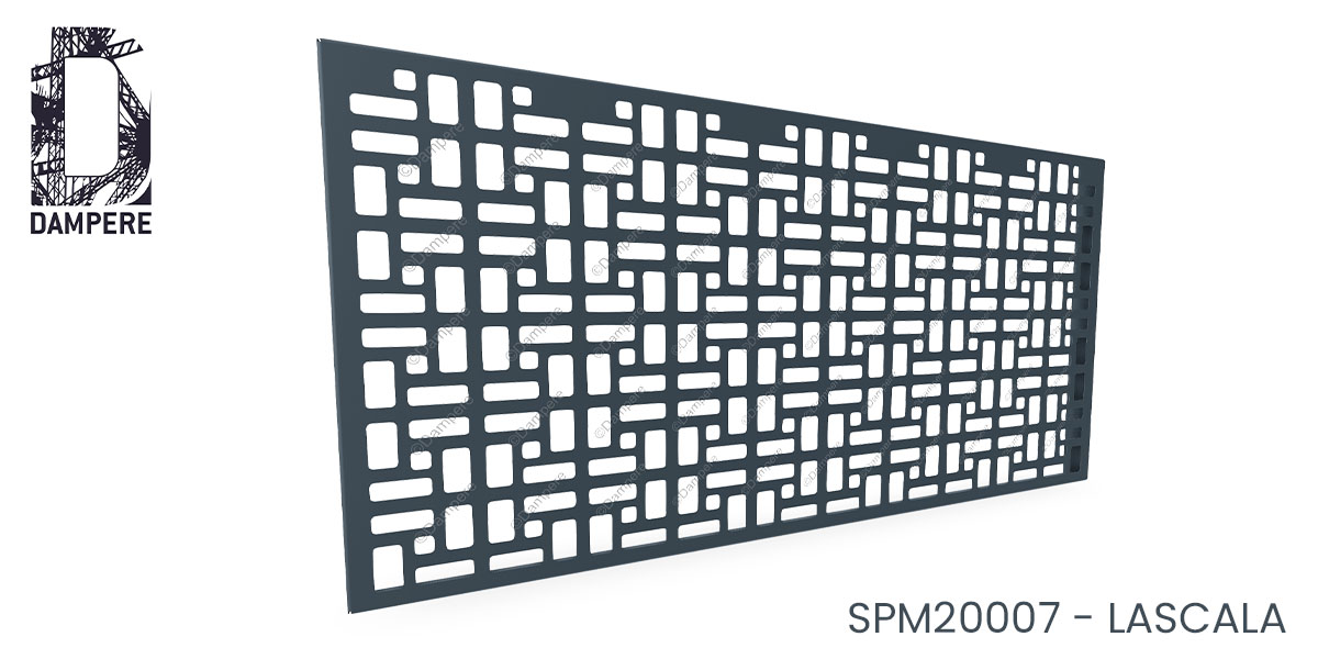 Le moucharabieh Lascala DAMPERE est composé de grandes découpes carrées et rectangulaires pour reconstituer une trame isométrique qui ressemble à un cannage métallique complexe. Motif géométrique avec une transparence supérieure à 50% de vide.Le moucharabieh métallique Lascala DAMPERE est une tôle perforée au motif géométrique audacieux et moderne, composé de grands trous carrés et rectangulaires qui s’imbriquent pour former une grille isométrique parfaitement symétrique. Ce design rigoureux et structuré évoque l'esthétique du cannage traditionnel, mais avec une interprétation contemporaine, où les formes géométriques dominent et apportent une touche de modernité. Chaque trou carré ou rectangulaire est découpé avec une précision remarquable, créant une composition à la fois harmonieuse et équilibrée, où l’espace plein et le vide s’entremêlent en parfaite proportion.