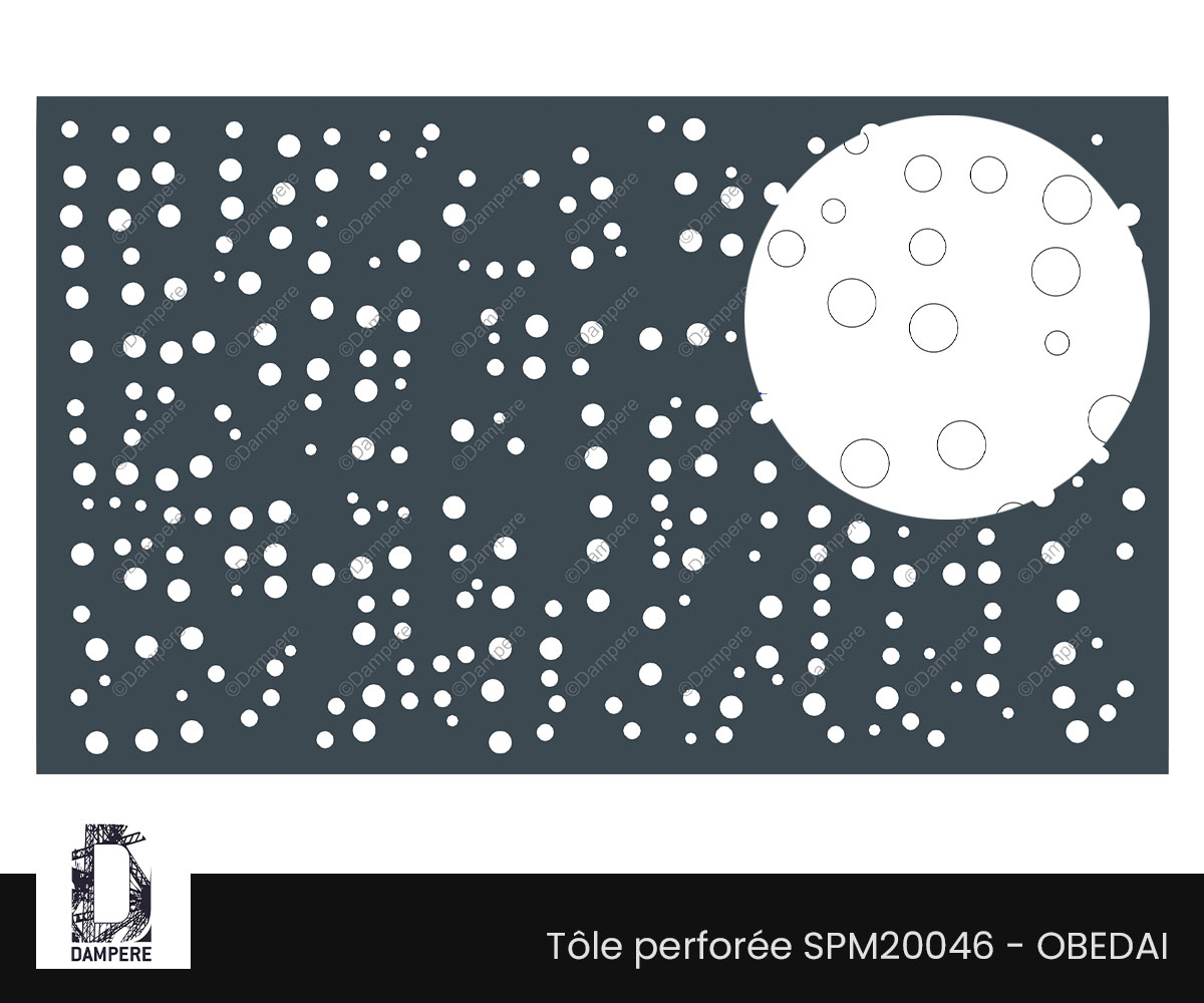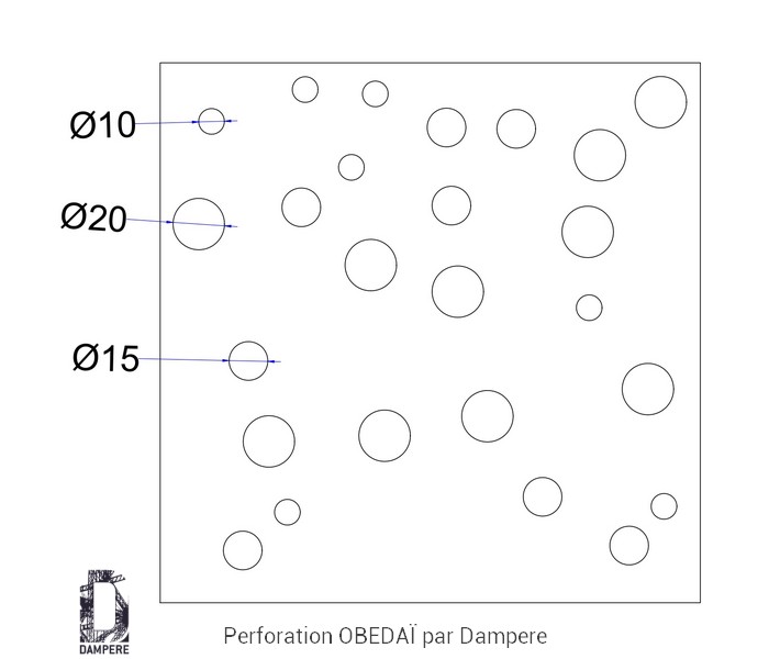La tôle perforée décorative Obedaï propose une dynamique visuelle unique grâce à son motif original dans lequel les zones pleines sont interrompues par des trous ronds de tailles variables, dont l’alignement semble perturbé par une sorte d'onde de choc invisible. Ce motif crée un effet visuel à la fois moderne et organique, évoquant l’idée d’un ordre perturbé par une force extérieure, conférant ainsi un dynamisme à la surface du métal. L'effet de l'onde de choc rompt la régularité géométrique attendue, en dispersant les perforations de manière subtile mais perceptible. Cela donne au motif un aspect déstructuré, créant une asymétrie captivante qui attire l'œil. Les trous ronds varient en taille, certains petits et discrets, d'autres plus grands, créant un contraste marqué entre les zones pleines et ajourées du moucharabieh.Usages