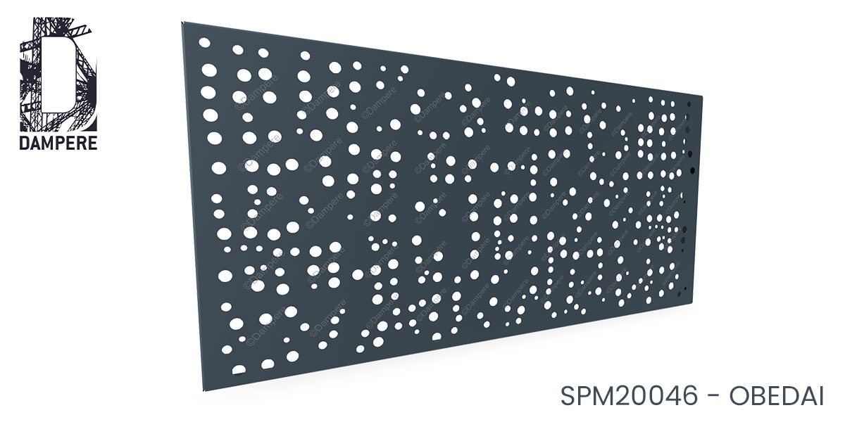 Le remplissage de garde-corps de balcon avec le décor Obedaï présente un motif unique qui combine modernité et dynamisme visuel du moucharabieh. Ce modèle se caractérise par des zones pleines perturbées par des perforations rondes de tailles variées, disposées de manière apparemment aléatoire, comme si leur alignement avait été affecté par une onde de choc. Ce contraste entre les sections pleines et les perforations crée un effet à la fois déstructuré et harmonieux, ajoutant une touche artistique au balcon. Vu depuis l’intérieur du balcon, le motif révèle un jeu de contrastes subtils entre les grandes et petites perforations, créant une profondeur visuelle unique. Les perforations de tailles différentes cassent la monotonie du métal perforé, attirant l'œil de l'observateur avec un effet de mouvement permanent. Plus l’observateur s’éloigne de la façade, plus la tôle perforée apparaît comme une surface continue avec des perforations irrégulières qui apportent une sensation de mouvement fluide, tout en assurant une transparence partielle. Le décor métallique Obedaï permet à la lumière naturelle de filtrer à travers les perforations, créant des ombres mouvantes sur la façade et des reflets lumineux tout au long de la journée. Ce jeu de lumière renforce l’impression de dynamisme et de vitalité sur la surface du balcon, tout en garantissant une luminosité intérieure sans sacrifier l’intimité. Grâce à la dominance des zones pleines, le garde-corps en tôle perforée Obedaï assure une protection visuelle efficace, tout en permettant une certaine ouverture vers l’extérieur. La combinaison de perforations irrégulières et de grandes zones pleines réduit la vue directe depuis l'extérieur tout en maintenant une certaine transparence pour profiter de la vue environnante. Le garde-corps design Obedaï est particulièrement adapté pour des résidences modernes et environnements urbains.Usages