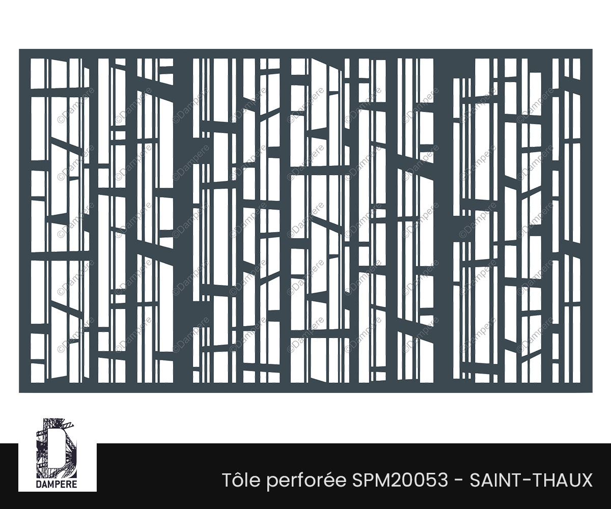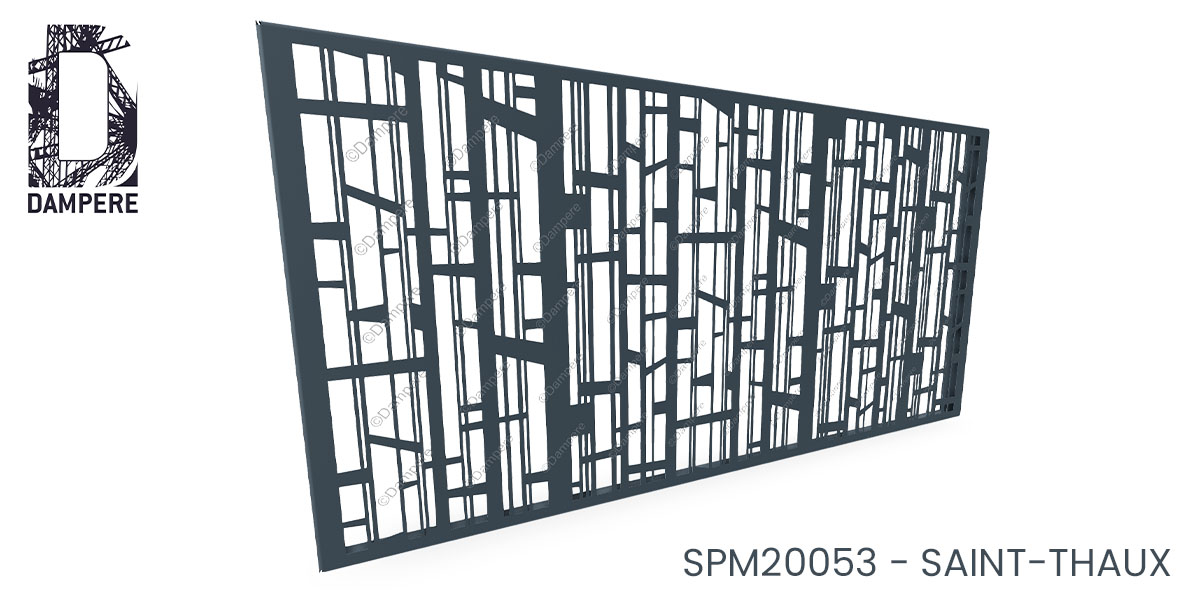 Le moucharabieh Saint Thaux est une tôle décorative audacieuse et graphique, composée d'un enchevêtrement de trapèzes verticaux aux contours rectilignes, entrecoupés de façon irrégulière. Chaque forme semble découpée au laser avec précision, s'insérant dans une trame verticale dense, où les pleins et les vides s'organisent dans une rythmique quasi musicale. Le motif ajouré joue avec les lignes droites, les obliques et les hauteurs variables pour créer un effet de vibration visuelle continue.
