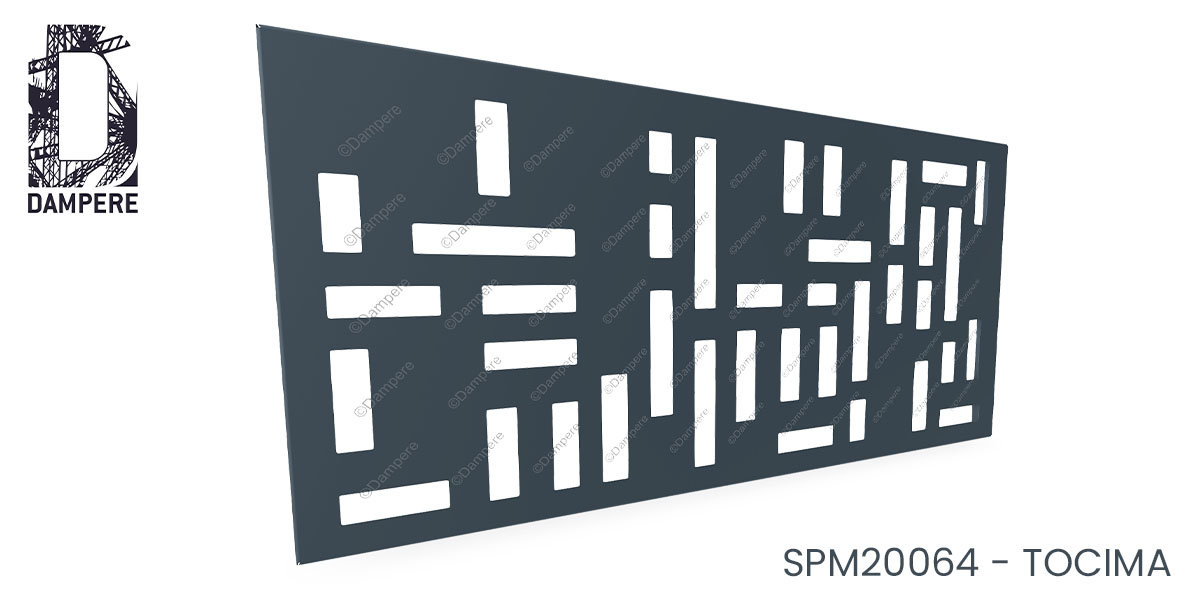La tôle décorative Tocima en découpe laser se distingue par un motif dynamique de lattes ajourées, agencées verticalement et horizontalement pour former un grand damier aléatoire. Cette composition géométrique unique offre à la fois rigueur et fluidité, où l’apparente simplicité des lattes crée un jeu visuel riche et captivant. Les alternances de pleins et de vides confèrent à la tôle déco un équilibre subtil entre transparence et opacité, permettant à la lumière naturelle de filtrer à travers les perforations de manière irrégulière, projetant des ombres du moucharabieh, à la fois graphiques et mouvantes sur les surfaces environnantes. La disposition aléatoire des lattes accentue l'effet de mouvement et de vibration visuelle, conférant à la tôle décorative Tocima une sensation de légèreté tout en restant structurée. Cela en fait une solution idéale pour ceux qui recherchent à animer visuellement des espaces extérieurs ou intérieurs tout en maintenant une certaine rigueur géométrique. Ce jeu d’entrelacements irréguliers apporte une signature visuelle forte et élégante, capable de transformer un simple élément fonctionnel en un véritable élément décoratif architectural.Usages