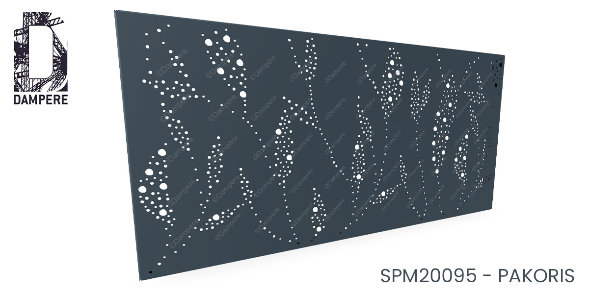 Le panneau perforé PAKORIS DAMPERE se distingue par un motif végétal dynamique, où de larges feuilles pointues, finement accrochées à leurs tiges, sont illustrées par une série de trous ronds de différents diamètres. Ce jeu de perforations, allant des plus petites aux plus grandes, crée un effet de pixelisation qui enrichit visuellement la structure. Les perforations plus larges viennent accentuer les détails et les contrastes, apportant une profondeur supplémentaire au motif. Cette conception subtile permet de capturer l'essence de la nature tout en lui conférant un aspect contemporain. Ce panneau décoratif joue parfaitement avec la lumière naturelle, projetant des ombres complexes et en mouvement qui évoquent un environnement végétal en perpétuelle évolution. Le contraste entre les différentes tailles de perforations donne au motif un caractère vivant et organique, idéal pour des applications en façades, garde-corps, ou clôtures urbaines. Le motif des feuilles, rendu de manière abstraite mais identifiable, s'intègre harmonieusement dans des projets architecturaux modernes, où l'on cherche à apporter une touche de nature stylisée tout en conservant une esthétique élégante et fonctionnelle. Le panneau PAKORIS permet ainsi de marier la transparence et l'occultation, tout en créant un décor végétal qui enrichit les espaces extérieurs et intérieurs, assurant une connexion visuelle avec l’environnement tout en offrant un design graphique puissant.Usages
