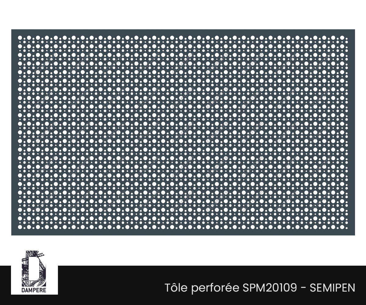 Le moucharabieh métallique Semipen se caractérise par un motif régulier et structuré, composé de grands trous ronds, alignés verticalement et horizontalement, et ponctués à intervalles réguliers de petits trous circulaires. L’ensemble est organisé selon une grille métallique orthonormée, où chaque rangée de perforations alterne les tailles de cercles pour créer une rythmique vibrante et visuellement dynamique, tout en conservant une grande lisibilité géométrique appréciée pour la restauration du patrimoine.